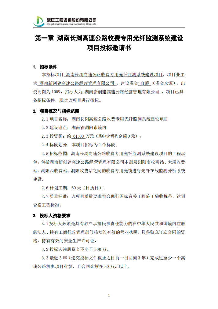 湖南長瀏高速公路收費專用光纖監測系統建設項目投標邀請書