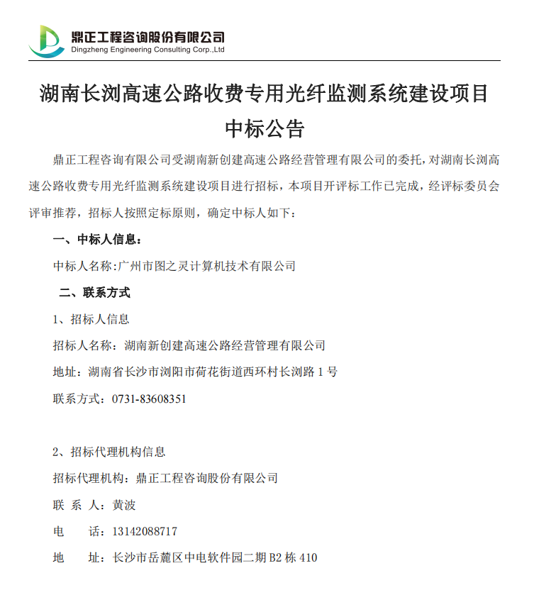 湖南長瀏高速公路收費(fèi)專用光纖監(jiān)測系統(tǒng)建設(shè)項目中標(biāo)公告