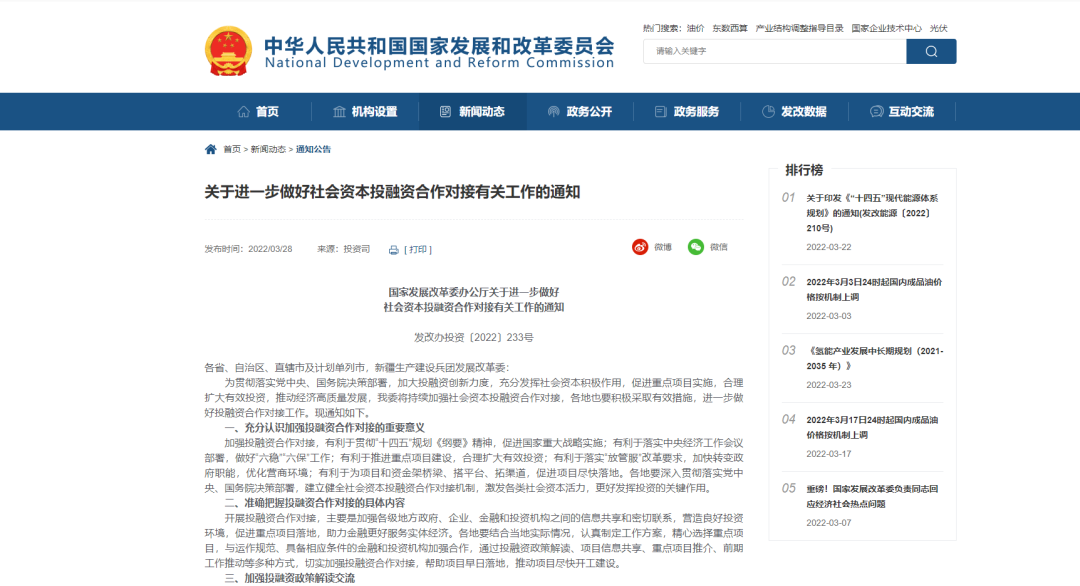 3月28日,國(guó)家發(fā)展改革委辦公廳印發(fā)《關(guān)于進(jìn)一步做好社會(huì)資本投融資合作對(duì)接有關(guān)工作的通知》(以下簡(jiǎn)稱《通知》),部署各地積極采取有效措施,進(jìn)一步做好投融資合作對(duì)接工作。