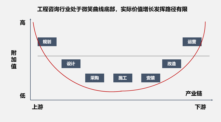 傳統(tǒng)工程咨詢處于微笑曲線底部,要實現(xiàn)價值增長需要咨詢業(yè)務(wù)“向前推進”、“向后延伸”。如傳統(tǒng)的全過程投控顧問服務(wù),已經(jīng)無法滿足客戶的需求,客戶迫切需要解決的是如何降低工程建設(shè)投資,如何做好概算控制,如何使項目增值等問題。