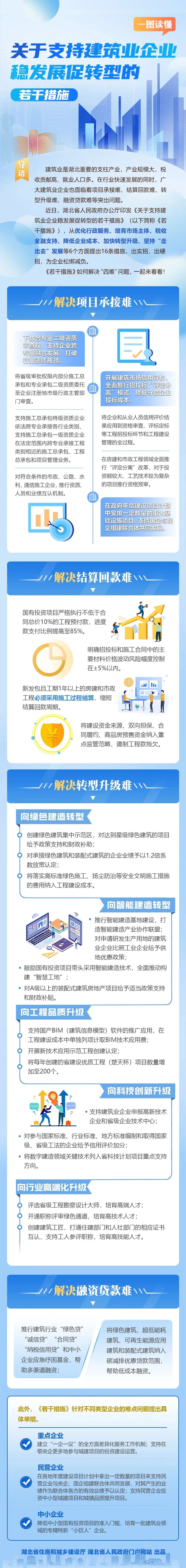 近日,湖北省人民政府辦公廳印發《關于支持建筑業企業穩發展促轉型的若干措施》(以下簡稱《若干措施》),從優化行政服務、培育市場主體、稅收金融支持、降低企業成本、加快轉型升級、堅持“走出去”發展等6個方面提出16條措施,出實招、出硬招,為企業松綁減負。