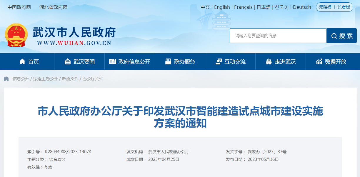 市人民政府辦公廳關于印發武漢市智能建造試點城市建設實施