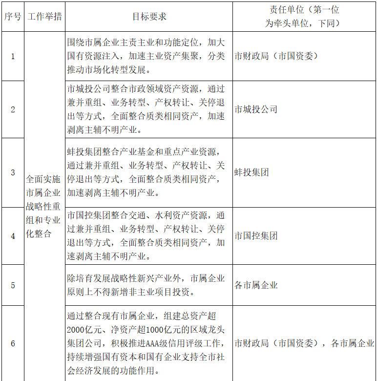 1.全面實施市屬企業戰略性重組和專業化整合。圍繞市屬企業主責主業和功能定位,加大國有資源注入,加速主業資產集聚,分類推動市場化轉型發展。市城投公司整合市政領域資產資源,蚌投集團整合產業基金和重點產業資源,市國控集團整合交通、水利資產資源,通過兼并重組、業務轉型、產權轉讓、關停退出等方式,全面整合質類相同資產,加速剝離主輔不明產業。除培育發展戰略性新興產業外,市屬企業原則上不得新增非主業項目投資。在此基礎上,通過整合現有市屬企業,組建總資產超2000億元、凈資產超1000億元的區域龍頭集團公司,積極推進AAA級信用評級工作,持續增強國有資本和國有企業支持全市社會經濟發展的功能作用。〔責任單位:市財政局(市國資委),各市屬企業〕