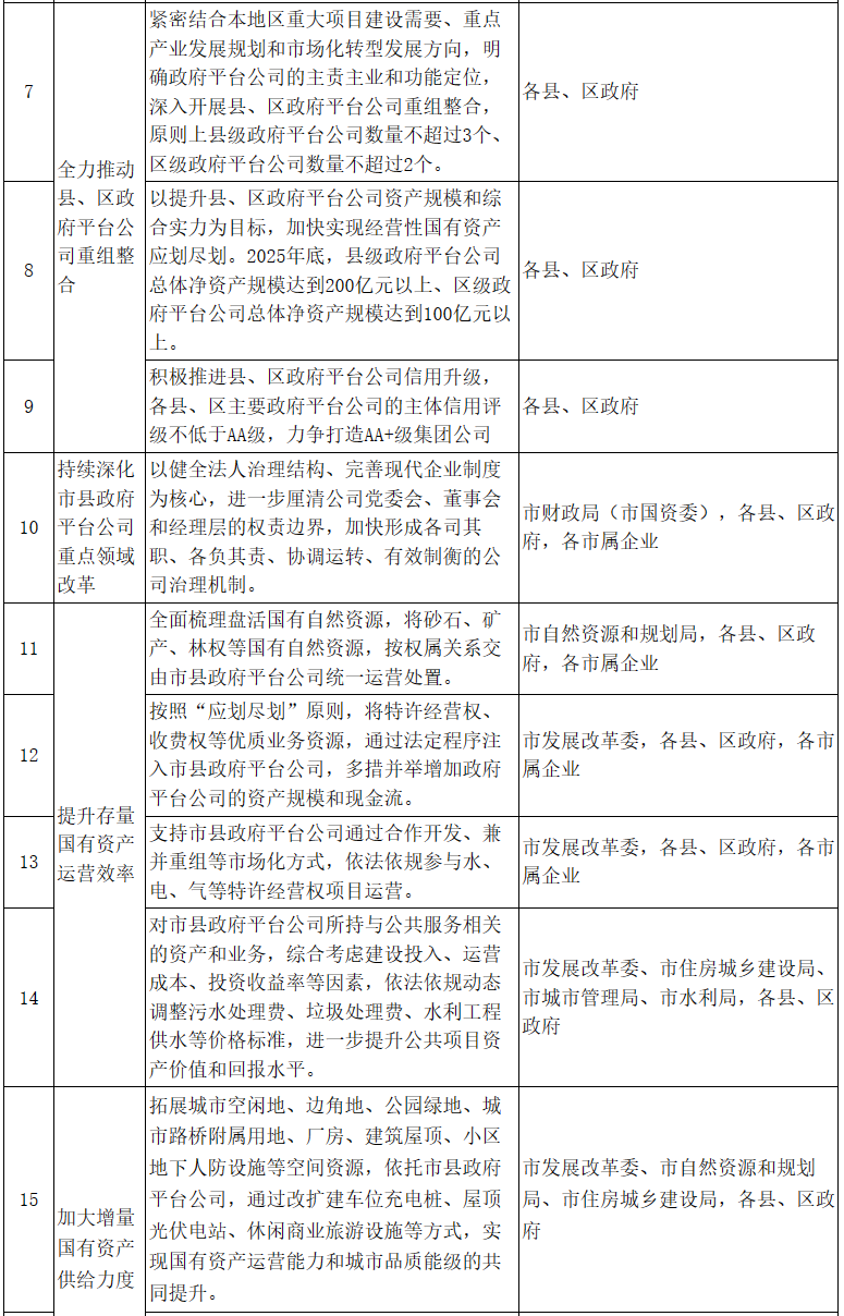 2.全力推動縣、區政府平臺公司重組整合。各縣、區政府(市高新區管委會、市經開區管委會,下同)要緊密結合本地區重大項目建設需要、重點產業發展規劃和市場化轉型發展方向,明確政府平臺公司的主責主業和功能定位,深入開展縣、區政府平臺公司重組整合,充分發揮資源集聚優勢。原則上縣級政府平臺公司數量不超過3個、區級政府平臺公司數量不超過2個。以提升縣、區政府平臺公司資產規模和綜合實力為目標,加快實現經營性國有資產應劃盡劃。2025年底,縣級政府平臺公司總體凈資產規模達到200億元以上、區級政府平臺公司總體凈資產規模達到100億元以上。積極推進縣、區政府平臺公司信用升級,各縣、區主要政府平臺公司的主體信用評級不低于AA級,力爭打造AA+級集團公司。(責任單位:各縣、區政府)