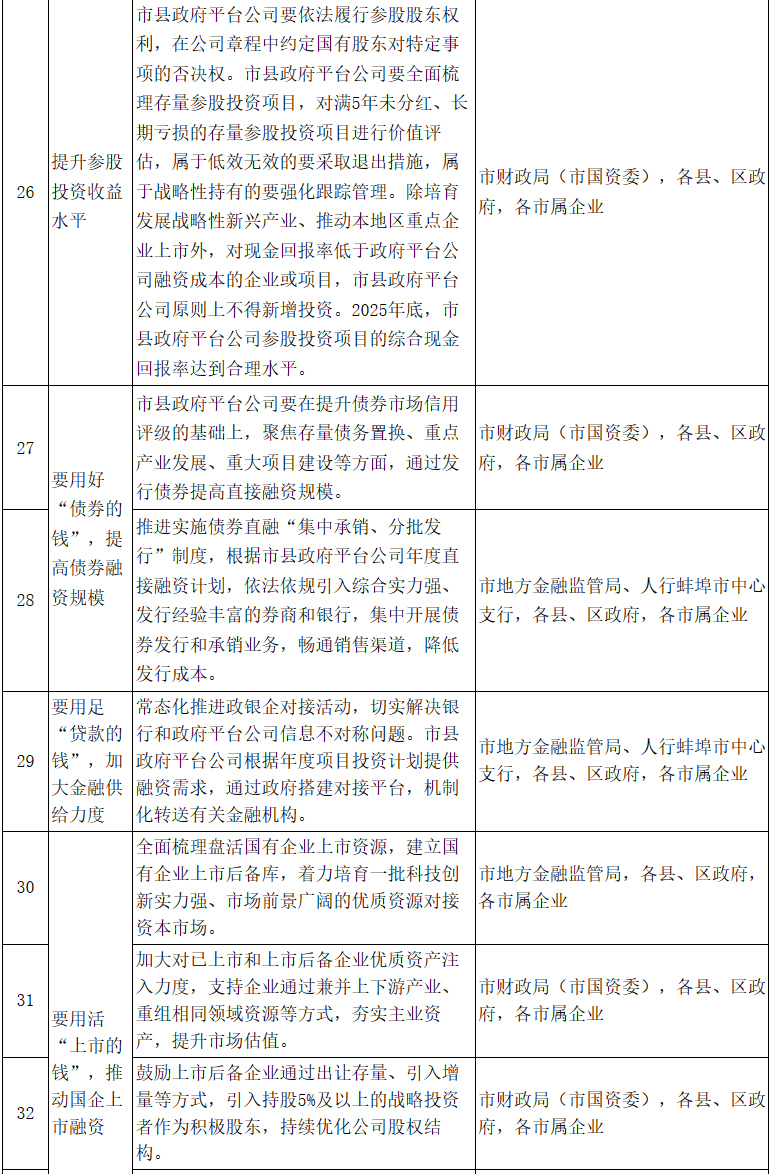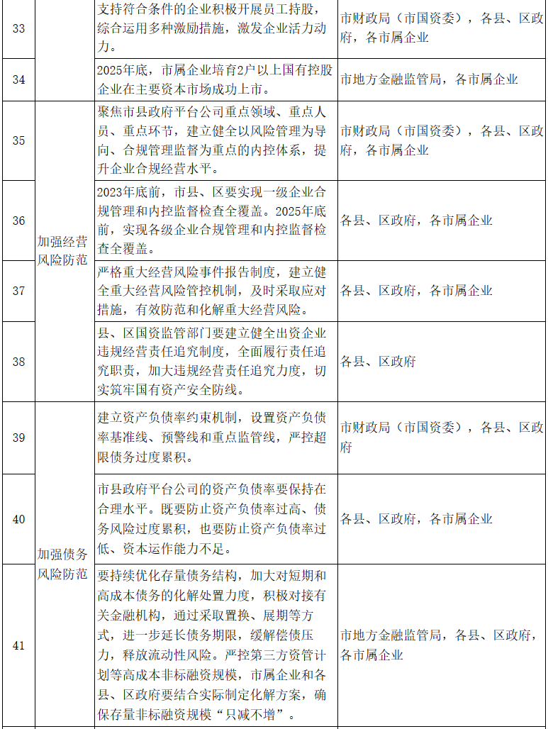 12.要用活“上市的錢”,推動國企上市融資。全面梳理盤活國有企業上市資源,建立國有企業上市后備庫,著力培育一批科技創新實力強、市場前景廣闊的優質資源對接資本市場。加大對已上市和上市后備企業優質資產注入力度,支持企業通過兼并上下游產業、重組相同領域資源等方式,夯實主業資產,提升市場估值。鼓勵上市后備企業通過出讓存量、引入增量等方式,引入持股5%及以上的戰略投資者作為積極股東,持續優化公司股權結構。支持符合條件的企業積極開展員工持股,綜合運用多種激勵措施,激發企業活力動力。2025年底,市屬企業培育2戶以上國有控股企業在主要資本市場成功上市。〔責任單位:市地方金融監管局、市財政局(市國資委),各縣、區政府,各市屬企業〕