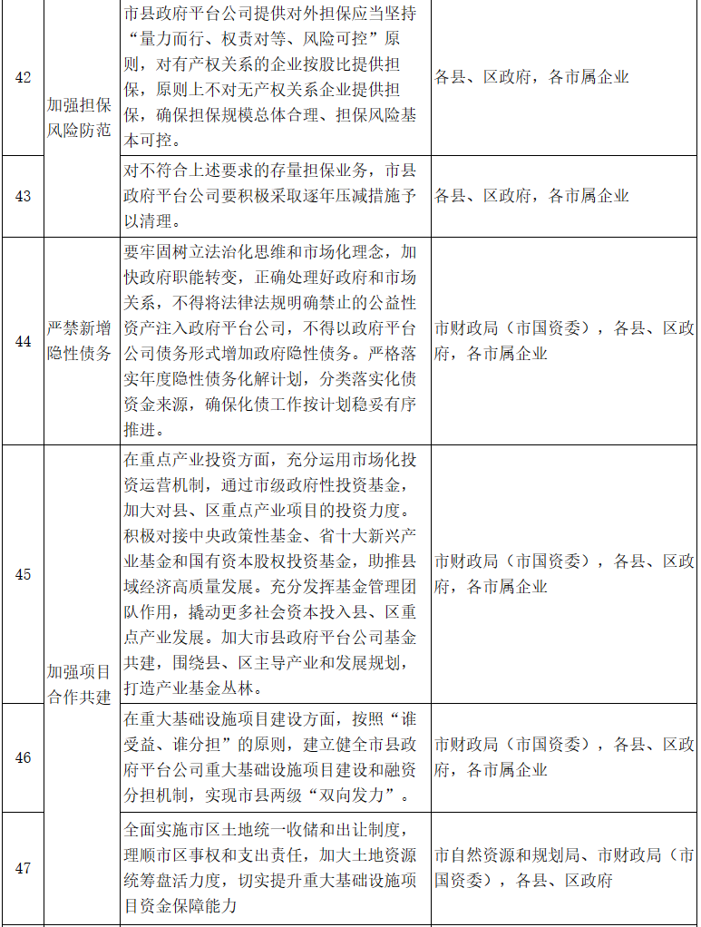 (三)明確任務分工,落實主體責任。各縣、區和有關部門、市屬企業要實行“一把手”工程,制定具體落實方案,明確年度任務計劃,細化責任分工,狠抓工作落實。全市上下要形成主要領導親自抓、責任部門具體推、平臺公司全力干的協同推進機制,對工作中存在的問題要及時研究解決,有力有序推動各項工作任務落實落地。