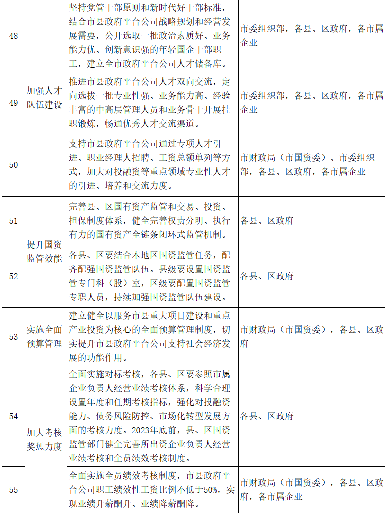 19.提升國資監管效能。切實將提升國資監管效能作為促進政府平臺公司市場化轉型和高質量發展的重要抓手,認真謀劃符合本地區政府平臺公司實際的改革深化措施。完善縣、區國有資產監管和交易、投資、擔保制度體系,建立健全權責分明、執行有力的國有資產全鏈條閉環式監管機制。各縣、區要結合本地區國資監管任務,配齊配強國資監管隊伍。縣級要設置國資監管專門科(股)室,區級要配置國資監管專職人員,持續加強國資監管隊伍建設。(責任單位:各縣、區政府)