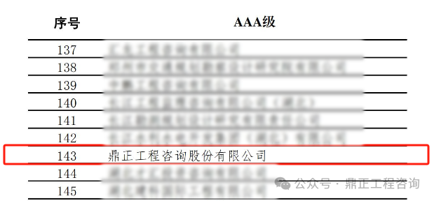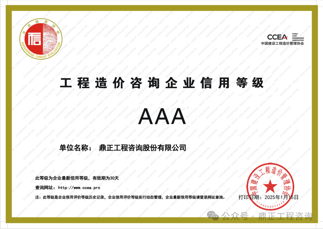 近日,中國(guó)工程咨詢(xún)協(xié)會(huì)發(fā)布了2024年度工程咨詢(xún)單位信用評(píng)價(jià)公告,鼎正憑借優(yōu)異的誠(chéng)信建設(shè)和信用管理能力,榮獲“AAA級(jí)信用等級(jí)”評(píng)價(jià)。
