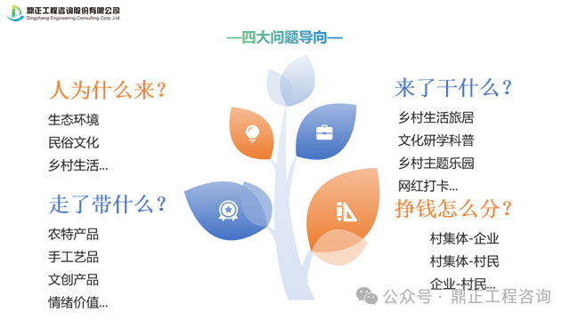 圍繞人為什么來、來了干什么、走了帶什么、掙錢怎么分四大問題去思考鄉(xiāng)村該怎么運營,去明確鄉(xiāng)村的主題定位、發(fā)展方向、核心產(chǎn)品、運營方式,更好地推進鄉(xiāng)村運營。