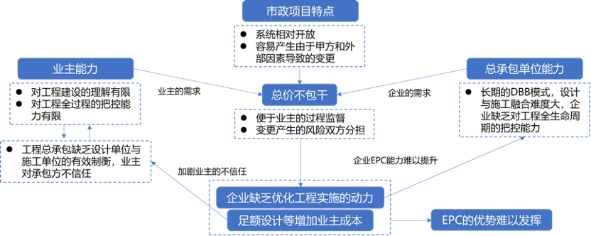 簡言之,市政項目的特點、業(yè)主和總承包單位的能力導(dǎo)致了市政工程項目是總價不包干的,而這使得總承包單位缺乏優(yōu)化設(shè)計施工融合的動力,甚至使得總承包單位進(jìn)行設(shè)計與施工的畸形融合。而這一方面使得業(yè)主對推行工程總承包興趣缺失甚至存在抵觸,對總承包單位的管理能力建設(shè)遲緩,另一方面也使得總承包單位的工程總承包能力建設(shè)推進(jìn)緩慢,而這又進(jìn)一步固化了總價不包干的模式,從而使得工程總承包的優(yōu)勢難以發(fā)揮,由此,工程總承包推進(jìn)艱難。