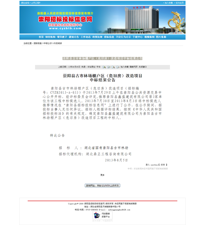 崇陽縣古市林場棚戶區(qū)(危舊房)改造項目中標結(jié)果公告
