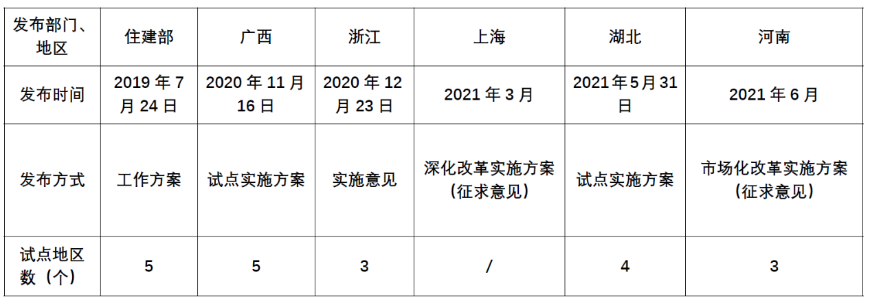 2020年7月24日,住房和城鄉(xiāng)建部辦公廳印發(fā)關(guān)于工程造價改革工作方案的通知(建辦標〔2020〕38號,以下簡稱38號文),通知決定在北京市、浙江省、湖北省、廣東省、廣西壯族自治區(qū)等五個地區(qū)開展方案試點工作。截至本稿起筆日(2021.6.3),廣西、浙江和湖北等三個試點地區(qū)相繼發(fā)布有關(guān)方案通知,北京、廣東尚未見官方相關(guān)信息。五個試點城市外,上海、河南等地的方案在征求意見中。