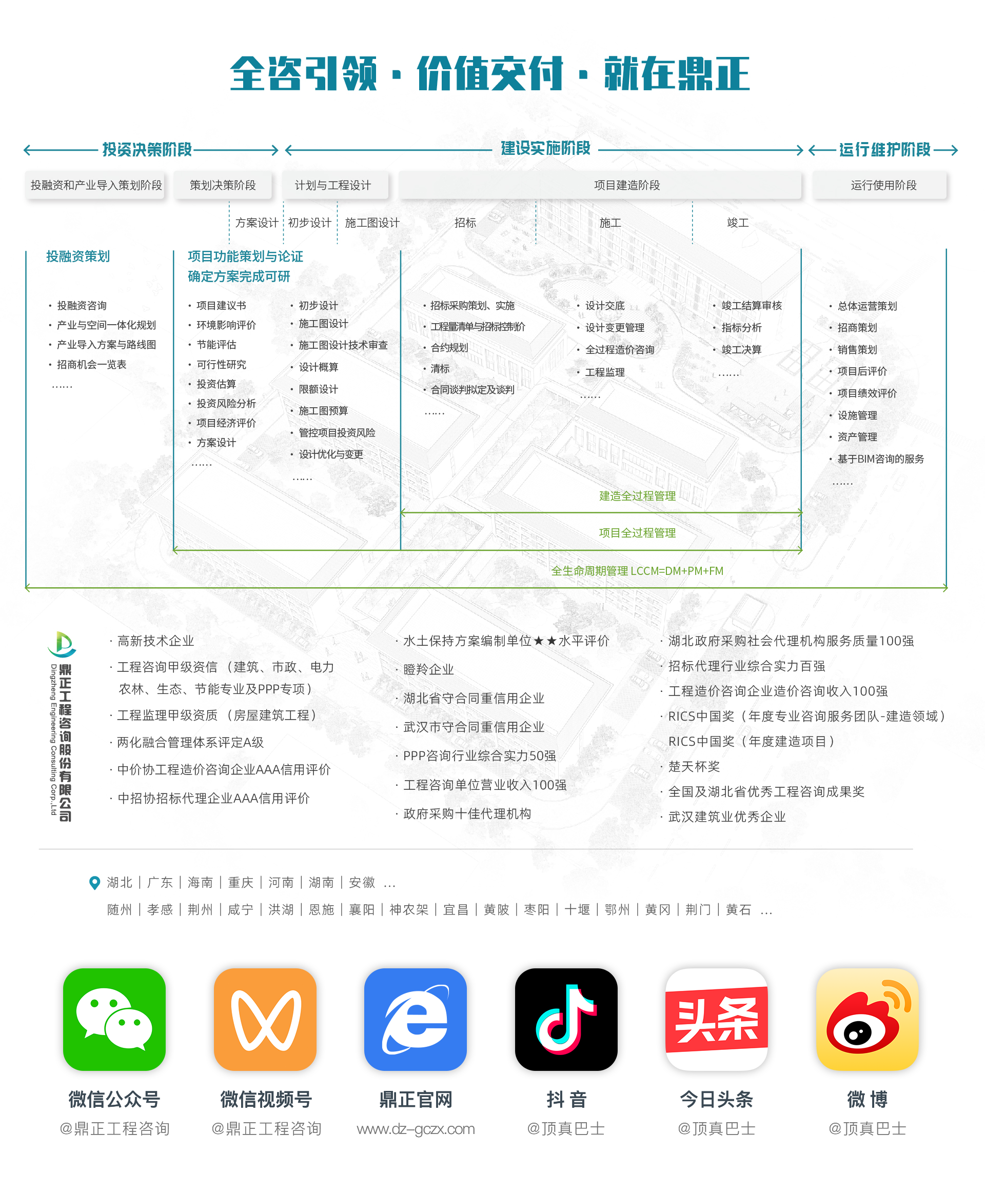 為適應高質量發展的總體要求及新質生產力所帶來的新需求,鼎正開始逐步轉型,深入探索全咨創新模式,并積極開拓新興領域。我們深度挖掘工程領域的潛在需求,精耕主業內的細分領域,不斷拓寬咨詢產品線,致力于構建多元化業務體系。同時,鼎正緊跟市場變化,靈活調整服務內容,在不同的項目類型和多種咨詢服務之間轉換融合,以滿足高質量發展和新質生產力的多樣化需求。