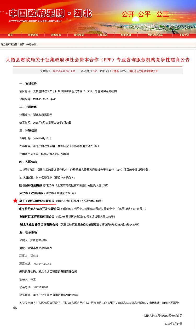 【經(jīng)營成果】我司入圍大悟縣財政局關(guān)于征集政府和社會資本合作(PPP)專業(yè)咨詢服務(wù)機(jī)構(gòu)