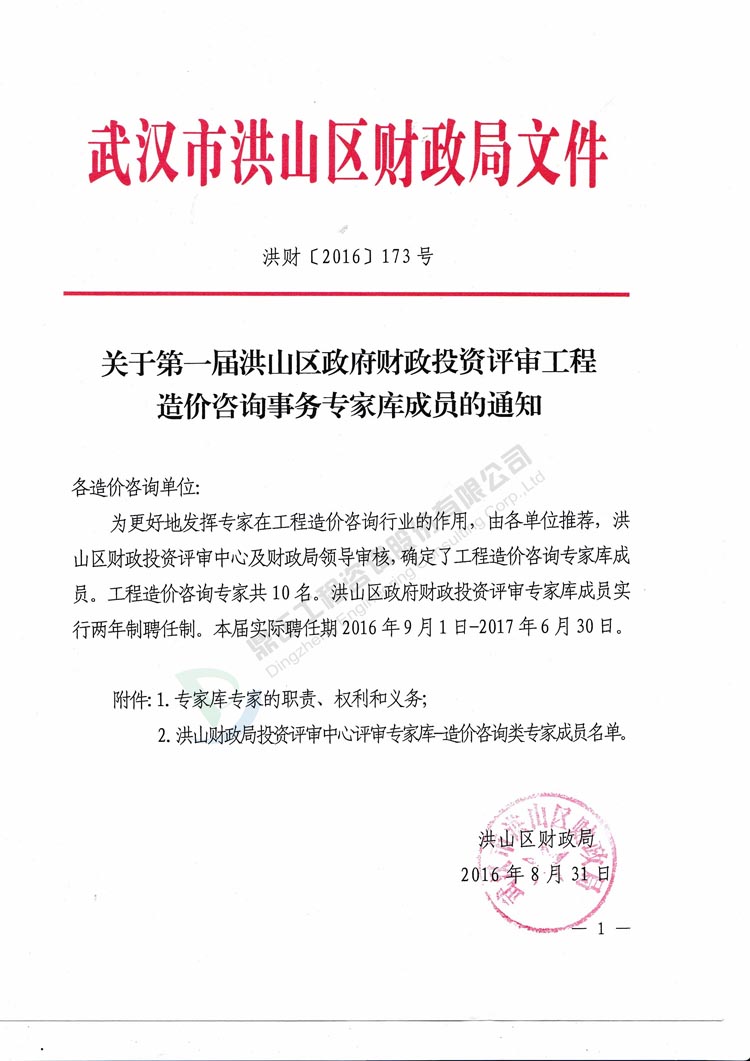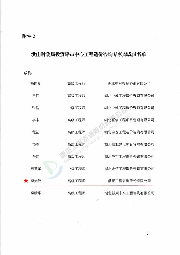 我司李光洲同志被武漢市洪山區(qū)財(cái)政局特聘為洪山區(qū)政府財(cái)政投資評審(工程造價(jià)咨詢事務(wù))專家