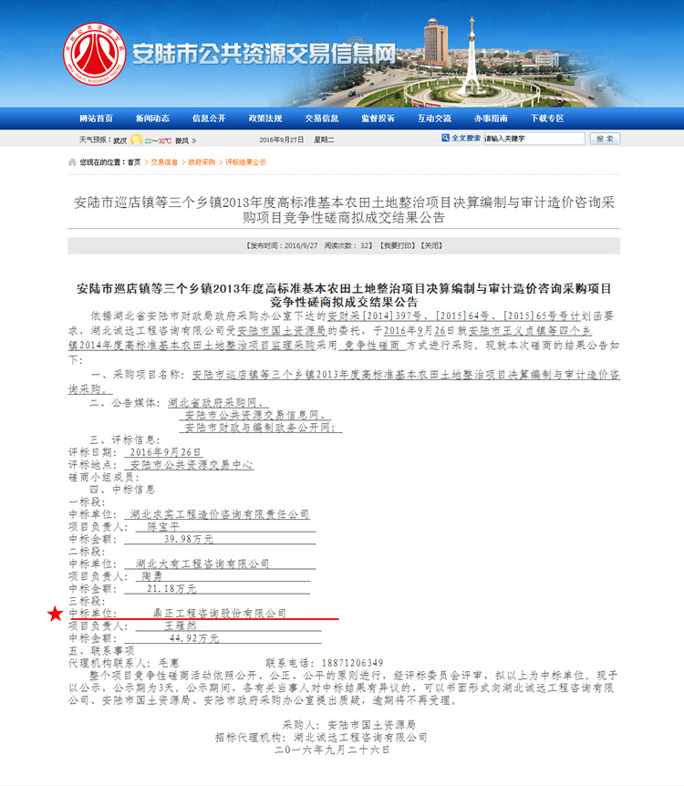 【經營成果】我司中標安陸市巡店鎮等三個鄉鎮2013年度高標準基本農田土地整治項目決算編制與審計造價咨詢采購項目