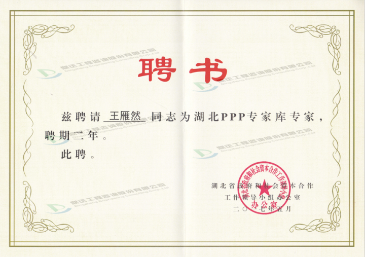 近日,湖北省政府和社會資本合作工作領導小組辦公室授予鼎正公司董事長王雁然先生、副總經理兼技術總監朱立冬教授為湖北省PPP專家庫專家。此前