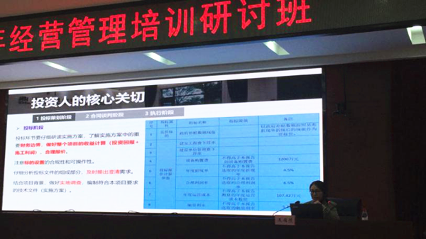 王雁然董事長從“PPP的發展趨勢”、“PPP概述”、“PPP政策”和“PPP全生命周期實務操作”四個方面進行了全面系統的講解,PPP高級項目經理王海蓮結合《京山市武荊高速公路連接線七寶山部分礦山地質環境恢復治理工程PPP項目》(以下簡稱“七寶山PPP項目”)案例分享了投資人的核心關切與解決方案。七寶山PPP項目是地礦系統參與的第一個PPP項目,也是湖北省首個礦山地質環境恢復治理工程采用PPP模式實施的項目。王海蓮經理分析了該項目從策劃到落地全過程的核心關切點,并對項目在執行過程中可能會出現的風險點給出相應建議方案。
