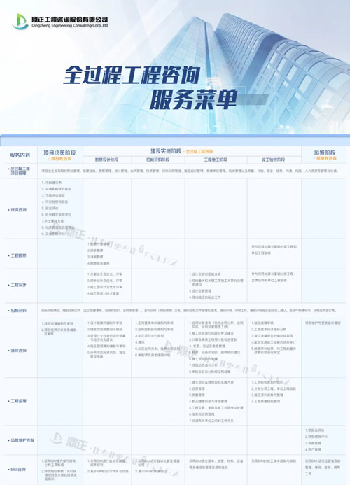 鼎正咨詢資質資信及業務能力已覆蓋工程咨詢全產業鏈,可提供全過程工程咨詢、PPP全生命周期咨詢、項目策劃、工程投資咨詢 、土地利用規劃、城鄉規劃、工程設計、工程監理、招標代理、政府采購、工程造價咨詢、BIM咨詢等服務。
